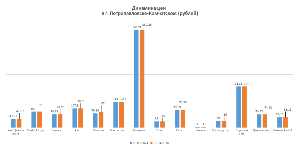 На прошедшей неделе, с 25.03.2024 по 01.04.2024, в с. Усть-Большерецке ценовая ситуация не изменилась.