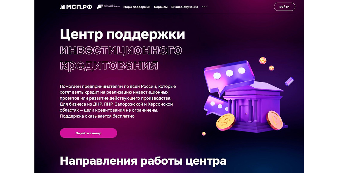 Акционерным обществом «Федеральная корпорация по развитию малого и среднего предпринимательства» (Корпорация МСП) на цифровой платформе запущен сервис «Центр поддержки инвестиционного кредитования» (ЦПИК). Он направлен на сопровождение и структурирование деловых инициатив субъектов малого и среднего предпринимательства в сфере обрабатывающих отраслей, легкой промышленности, туризма, креативных индустрий, информационных технологий с последующей возможностью предоставления гарантий и поручительств Корпорации МСП для реализации таких проектов.