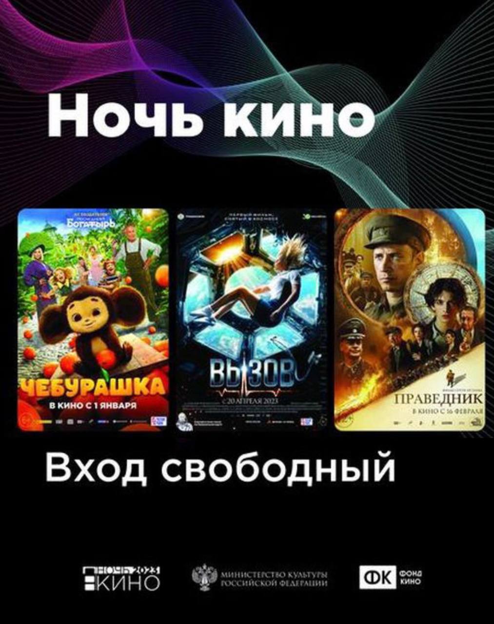 Всероссийская акция в этом году состоится уже в восьмой раз. Участники «Ночи кино» по всей стране смогут бесплатно посмотреть три самых кассовых отечественных фильма этого года: «Чебурашка» (режиссёр Дмитрий Дьяченко), «Вызов» (режиссёр Клим Шипенко), «Праведник» (режиссёр Сергей Урсуляк).
