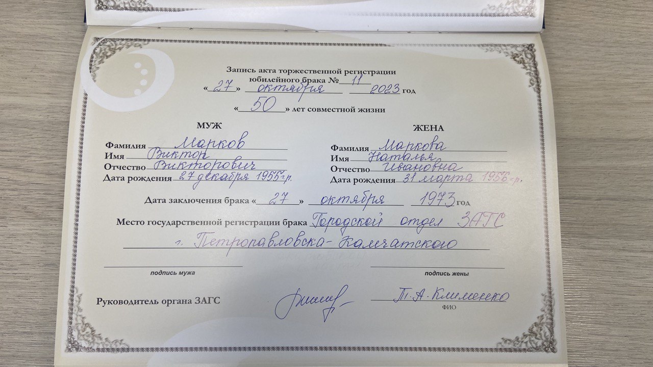 В торжественной обстановке супругам вручили Приветственный адрес губернатора Камчатского края Владимира Солодова. Юбиляры поставили подписи в книге записи актов торжественной регистрации юбилейного брака. В ней составлена 11-я актовая запись в 2023 году.
