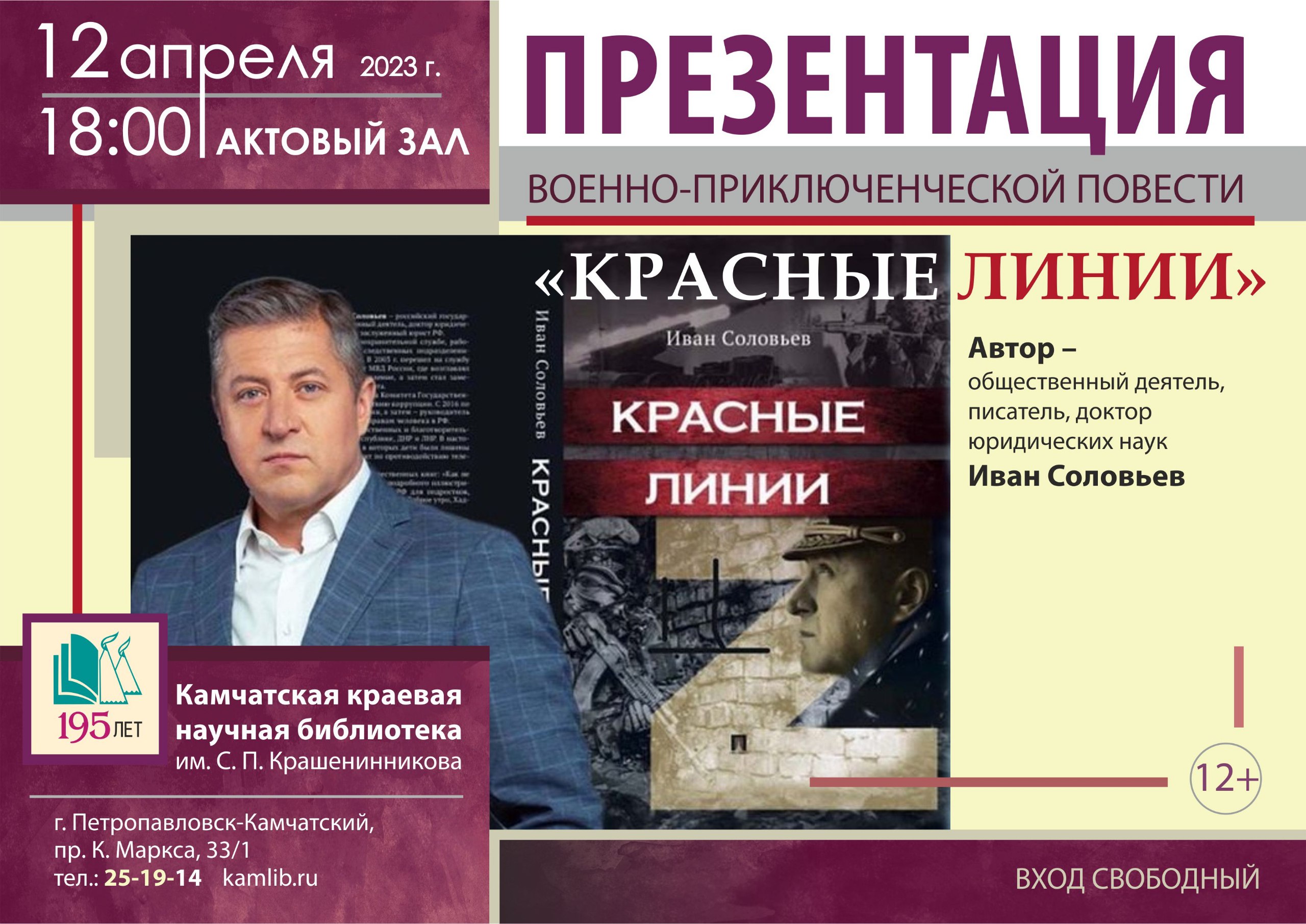 Презентация военно-приключенческой книги «Красные линии» пройдет 12 апреля в Камчатской краевой научной библиотеке им. С. П. Крашенинникова. Встречу проведет сам автор издания – общественный деятель, писатель, доктор юридических наук Иван Соловьев. Посетить презентацию приглашают всех желающих.
