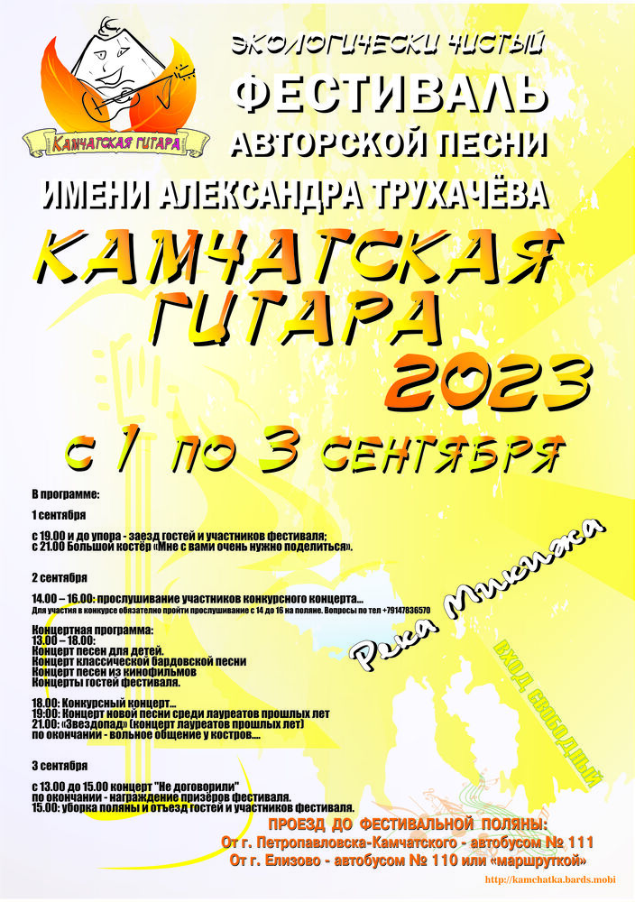 Со 1 по 3 сентября у реки Микижа в Елизовском районе состоится традиционный фестиваль авторской песни «Камчатская гитара» имени Александра Трухачёва, сообщили РАИ КАМЧАТКА-ИНФОРМ» организаторы.