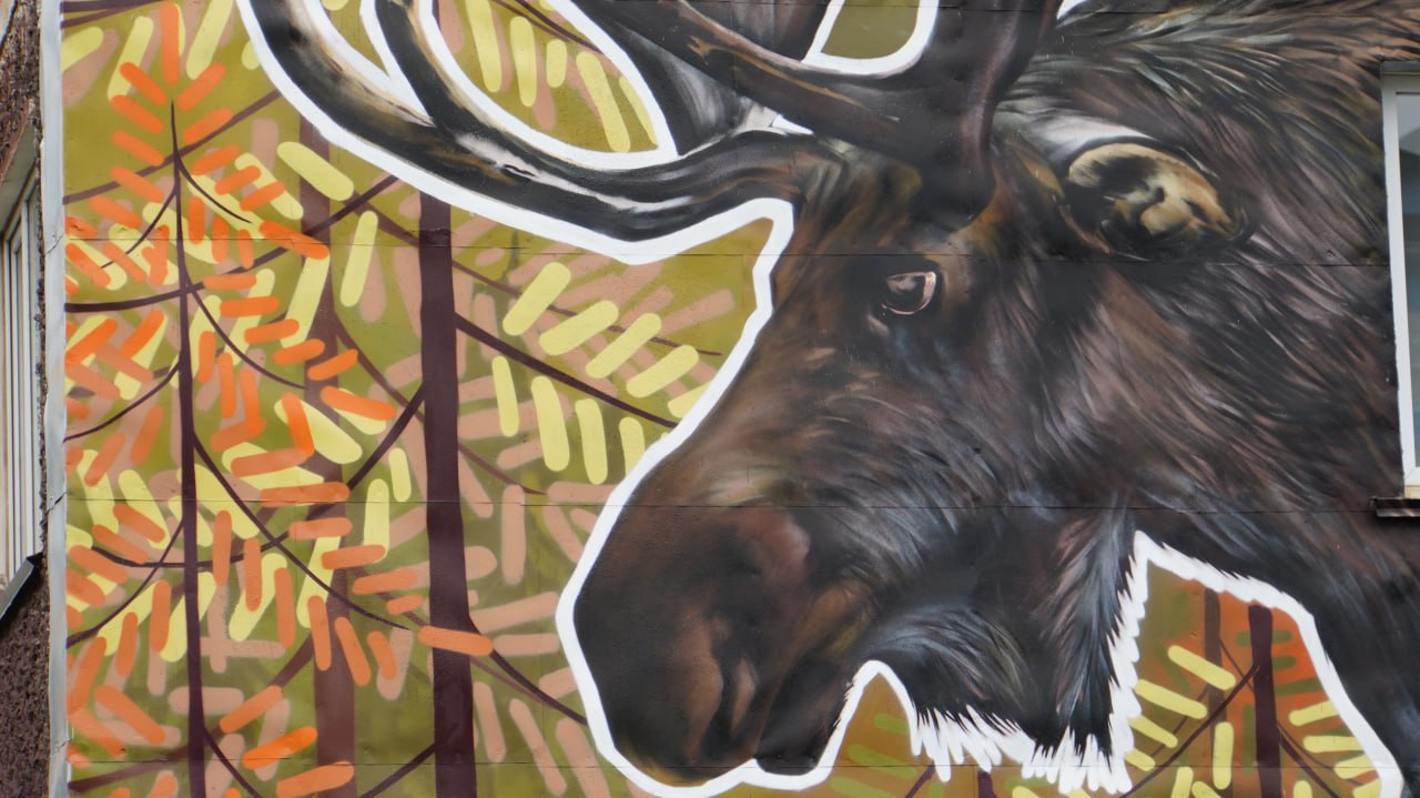 Фасад дома № 19 на проспекте Карла Маркса украшает Сергей Салин из Подмосковья. Его мурал – лось и камчатская тайга. Художник в августе успел завершить другое городское граффити – «Торжество стихии» на улице Первомайской.