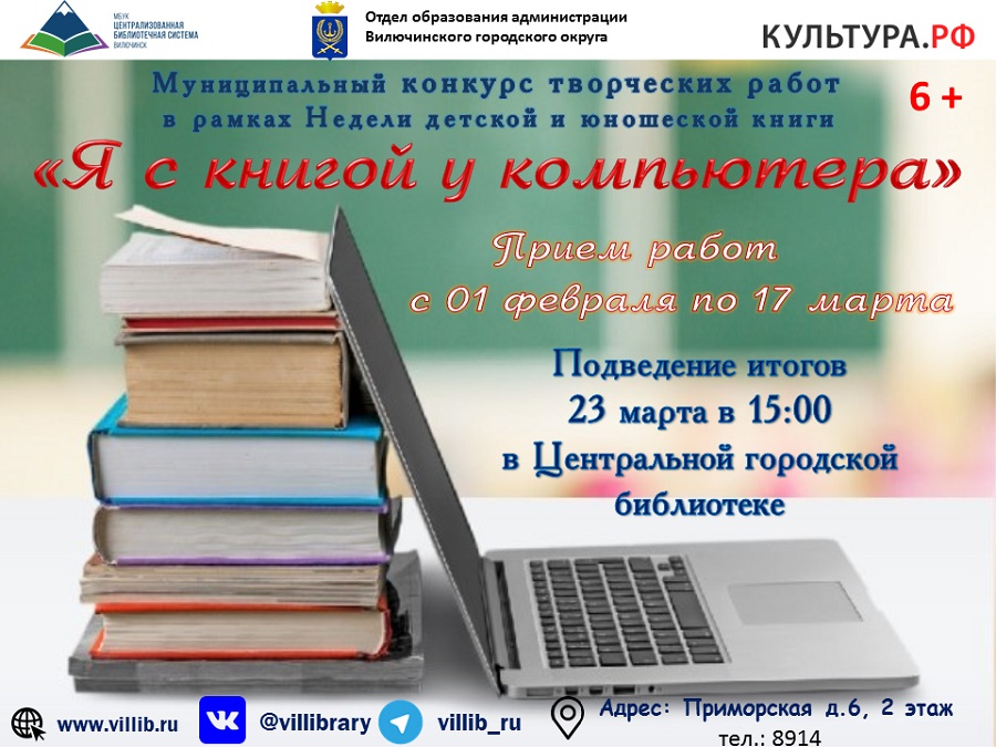 Завершающий этап конкурса «Я с книгой у компьютера» и награждение победителей состоится 23 марта в 15.00 в Центральной городской библиотеке по адресу: г. Вилючинск, ул. Приморская, д. 6, 2 этаж.