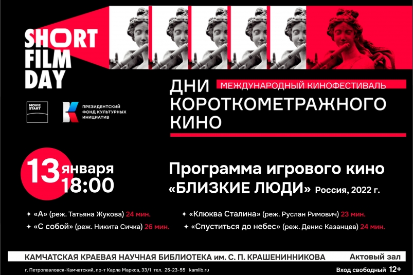 В пятницу, 13 января, в Петропавловске-Камчатском в краевой научной библиотеке им. С.П. Крашенинникова пройдет показ фильмов в рамках Международного фестиваля "Дня короткометражного кино" (SHORT FILM DAY), сообщает ИА KamchatkaMedia со ссылкой на городскую администрацию.