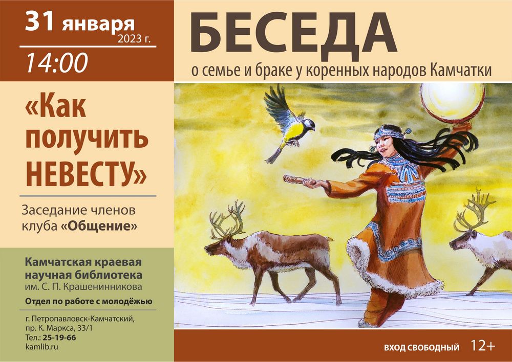 31 января в 14:00 в отделе по работе с молодежью пройдет встреча в клубе «Общение». Участники узнают много интересного о брачных обычаях и семейной жизни коренных народов Камчатки.