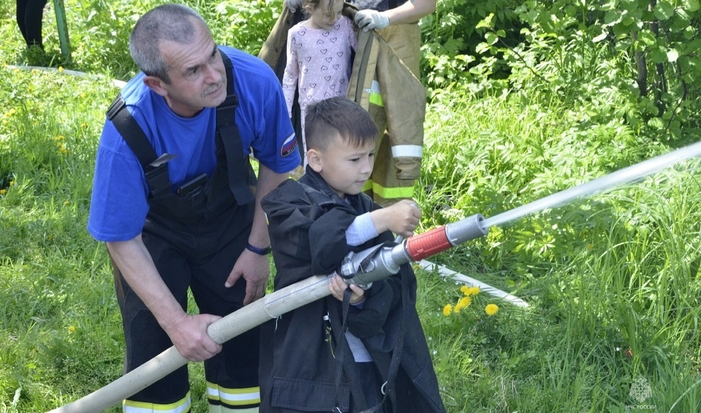 После этого, каждый из ребят смог почувствовать себя в роли настоящего «тушилы», ведь детям не только разрешили посидеть в пожарном автомобиле, но и дали подержать пожарный ствол, в который под большим напором была подана вода. Желающих потушить условный пожар было настолько много, что огнеборцам пришлось запустить ещё одну мотопомпу.