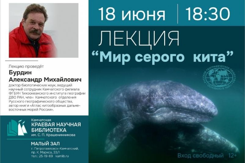 18 июня в 18:00 в малом зале краевой библиотеки пройдет лекция "Мир серого кита" (12+). Жителей Камчатки приглашают больше узнать об этих уникальных редких животных, сообщает ИА KamchatkaMedia.