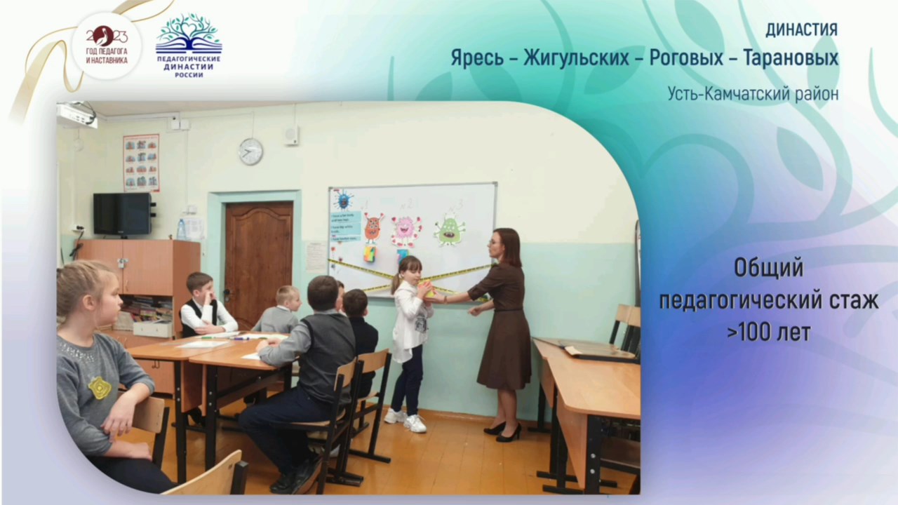 Профессиональный стаж камчатских педагогических династий достигает нескольких десятилетий или даже столетий. Так, династия из Соболевского района Лепехиных – Поздняковых – Маловых насчитывает трудовой стаж более 130 лет, представители трех поколений связали свою жизнь с системой дошкольного образования Камчатского края. Династия из Усть-Камчатского района Яресь – Жигульских – Роговых – Тарановых насчитывает три поколения и трудовой стаж более 100 лет. Педагогический стаж семьи Морозовых из села Соболево небольшой, всего 45 лет, но династия уже внесла значимый вклад в судьбы своих учеников и воспитанников.