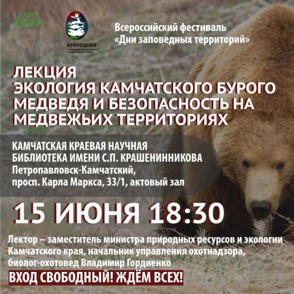 Общественная встреча, посвящённая экологии камчатского бурого медведя и правилам безопасности на медвежьих территориях, пройдет 15 июня в Камчатской краевой научной библиотеке имени С. П. Крашенинникова,