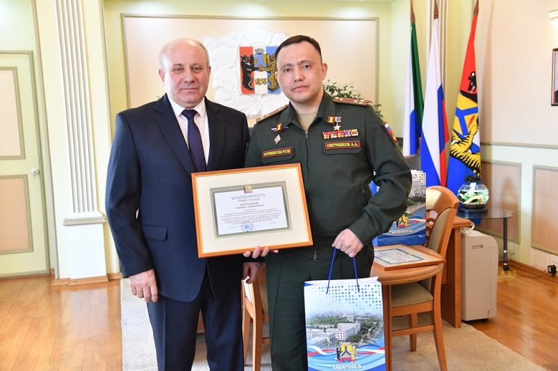 После дружеской беседы мэр города Сергей Кравчук вручил Герою России Азатбеку Омурбекову благодарность за работу с мобилизованными хабаровчанами и передал военным 10 командирских часов с гербом краевой столицы. Их передадут мобилизованным хабаровчанам в преддверии Дня защитника Отечества. Награды достанутся бойцам, которые достойно зарекомендовали себя во время выполнения задач специальной операции.
