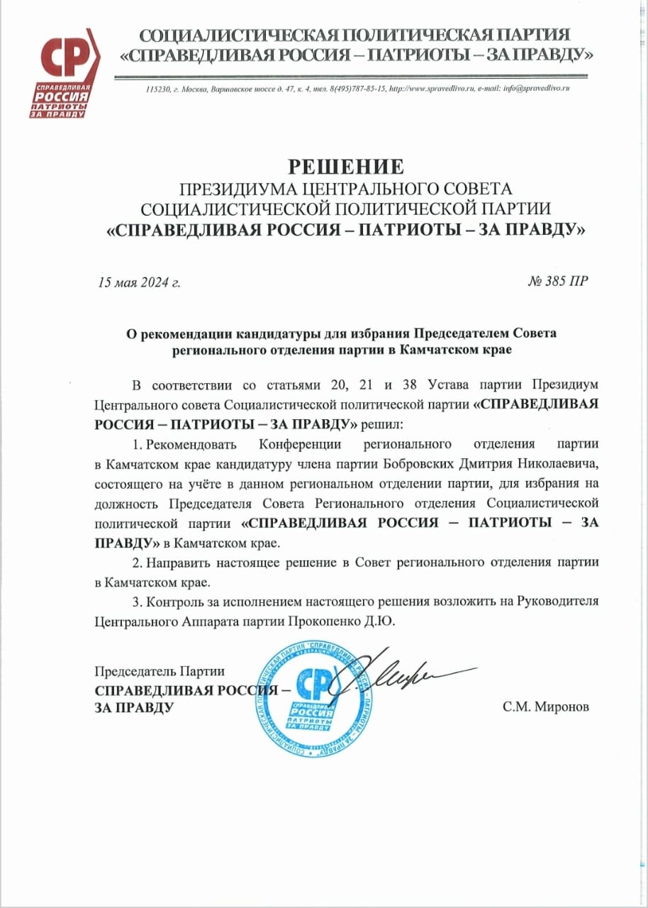 Президиум Центрального совета партии СПРАВЕДЛИВАЯ РОССИЯ – ЗА ПРАВДУ рекомендовал действующего лидера камчатских социалистов Дмитрия Бобровских для избрания Председателем Совета регионального отделения партии СРЗП в Камчатском крае. Все члены Президиума Центрального совета голосовали "ЗА"!