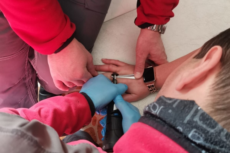 Утром, 24 февраля, в отряд приехала женщина и попросила о помощи. Некоторое время назад она получила травму руки, развился отёк и кольцо, которое она носила не снимая на одном из пальцев, врезалось в кожу. Женщина обратилась в травмпункт, но медики не смогли решить её проблему, и на то были веские причины — требовались навыки владения совсем другими, не медицинскими, инструментами.