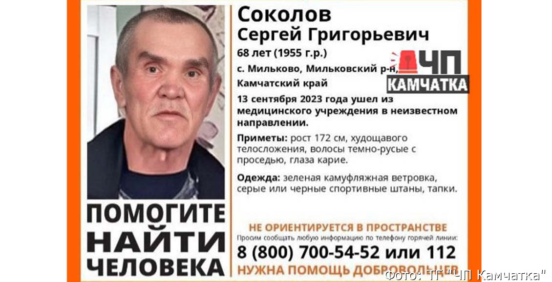 На Камчатке разыскивается житель села Мильково Соколов Сергей Григорьевич, 1955 года рождения. 13 сентября мужчина ушёл из медучреждения и до настоящего времени его местонахождение не известно.