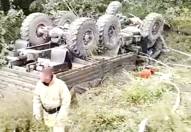Грузовик на встречной полосе задел внедорожник «Тойота Лэн Крузер Прадо». После столкновения «КамАЗ» съехал в кювет и опрокинулся на крышу.