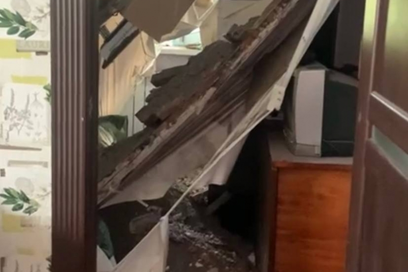 В двухэтажном доме обвалился потолок в квартире пенсионеров. Сверху посыпалась штукатурка, и обвалилась крупная балка.