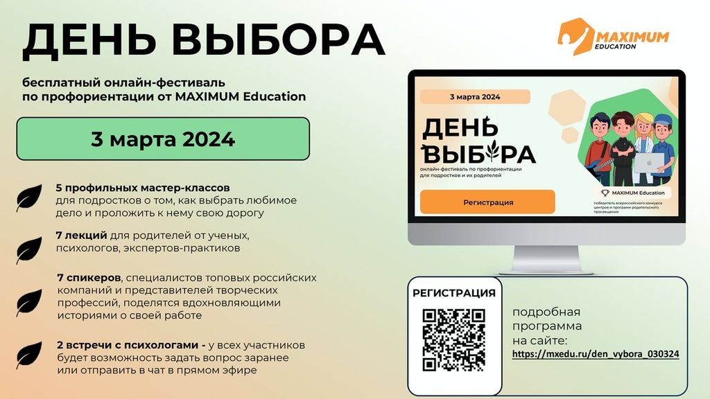 Ознакомиться с программой и зарегистрироваться на фестиваль «День Выбора» можно на официальном сайте по ссылке: https://mxedu.ru/den_vybora_030324