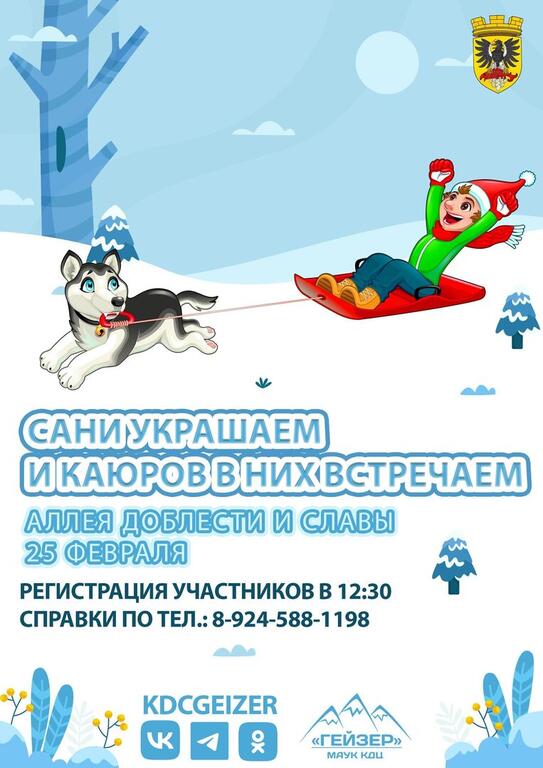Уважаемые родители и дорогие дети! Стать частью большой гонки и общего праздника можно, используя творческий подход и креативные идеи, чтобы украсить сани. Участвуйте в конкурсе, предварительно позвонив по номеру телефону, указанному на афише. 25 февраля в 12.30 начнется регистрация, а после старта гонки красивые сани будут представлены зрителям, которые и выберут победителя.