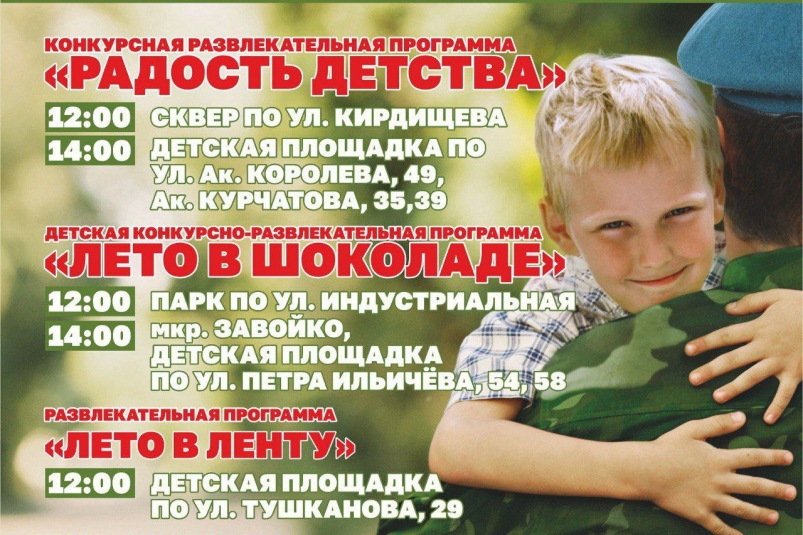 — конкурсная развлекательная программа "Радость детства" пройдет в сквере на ул. Кирдищева. Начало в 12 часов. Эта же программа с 14 до 15 часов будет проведена в микрорайоне "Горизонт" — на детской площадке по ул. Ак. Королева, 49 — ул. Ак. Курчатова, 35, 39.