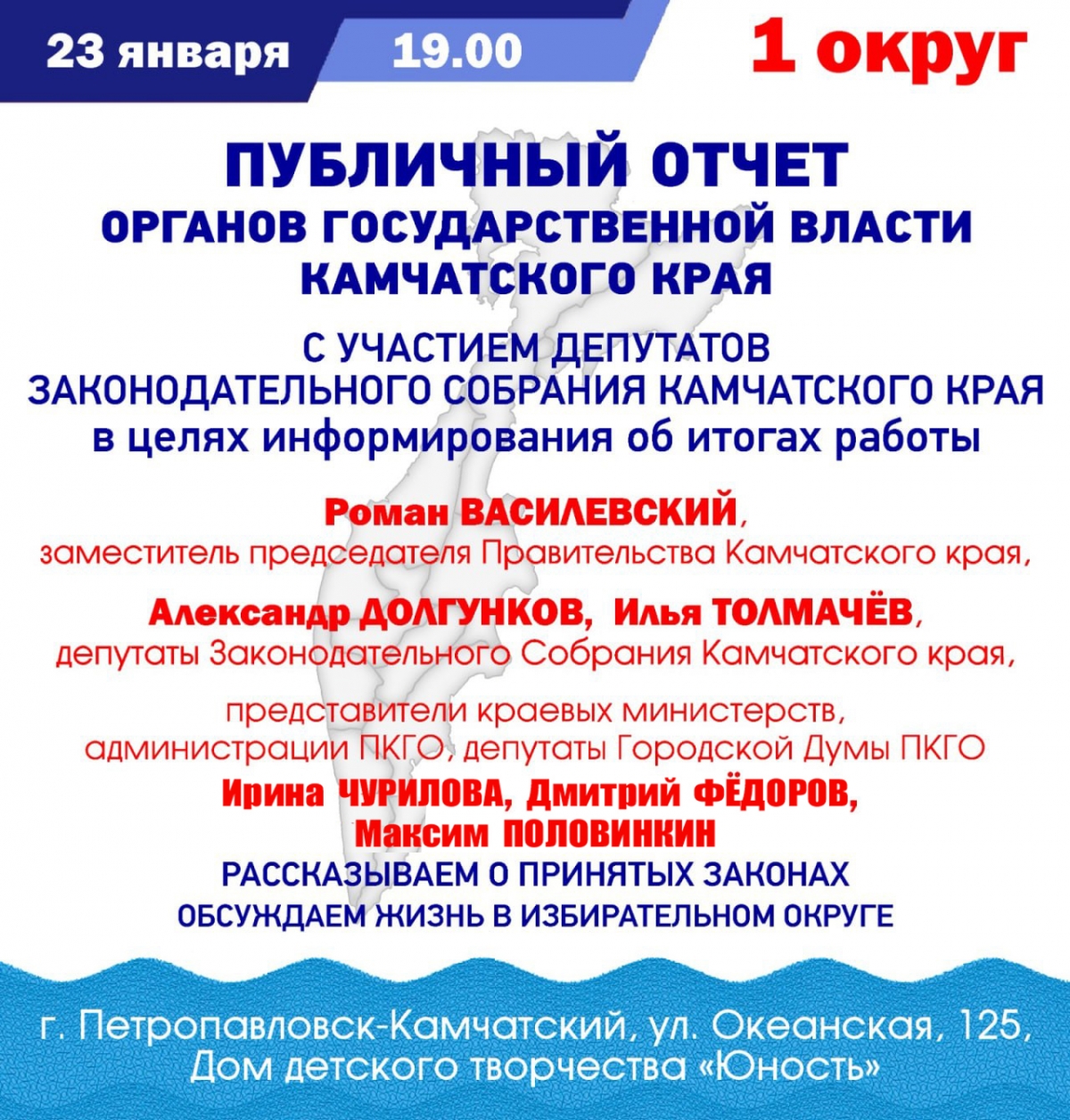 Ежегодный отчёт публичной власти Камчатки с участием депутатов об итогах работы начнётся сегодня, 23 января, в 19:00 в избирательном округе № 1.