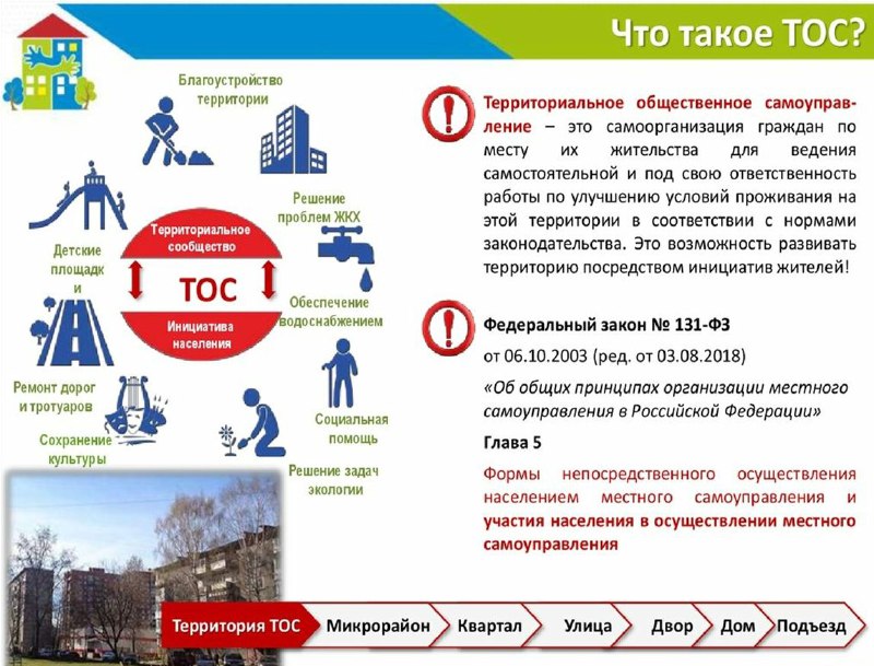 ТОС является формой самоорганизации граждан по месту их жительства для реализации собственных инициатив.