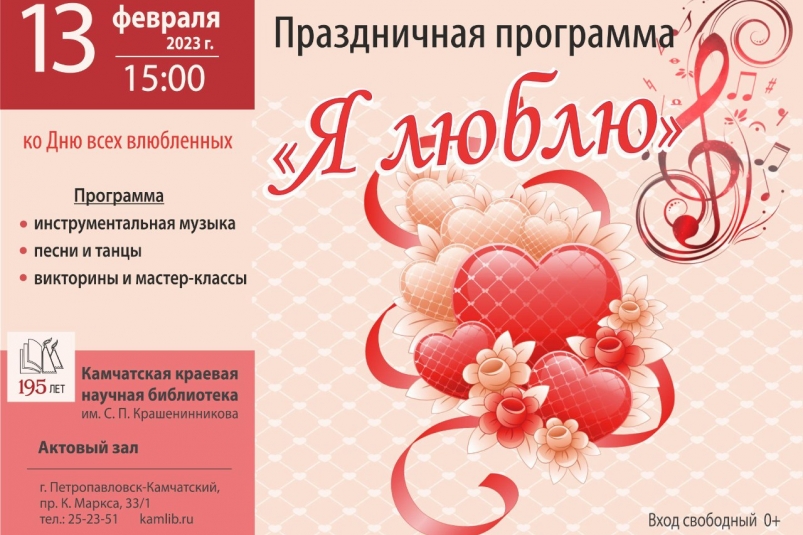 13 февраля в 15:00 в актовом зале краевой библиотеки пройдет праздничная программа "Я люблю", посвященная Дню всех влюбленных, сообщает ИА KamchatkaMedia со ссылкой на ККНБ им. С.П. Крашенинникова.