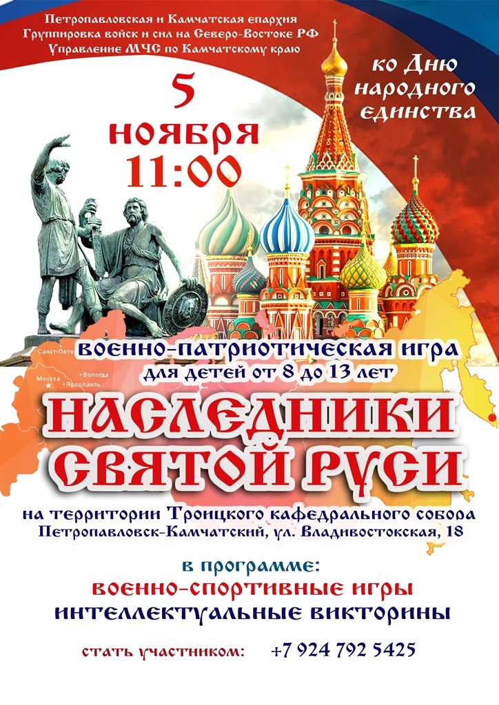 5 ноября, ко Дню народного единства, по благословению архиепископа Петропавловского и Камчатского Феодора, на территории Троицкого Кафедрального собора состоится военно-патриотическая игра «Наследники святой Руси» .