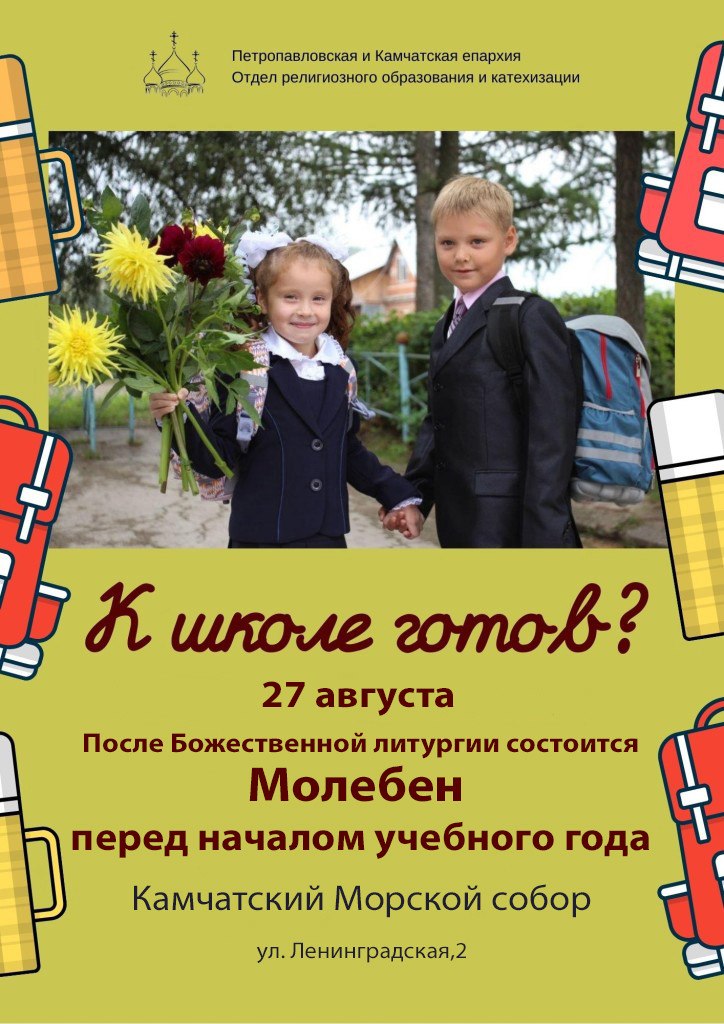 27 августа, в воскресенье, в верхнем храме Морского собора будет совершен молебен перед началом учебного года для учащих и учащихся. Богослужение состоится по окончании Божественной литургии с участием Архиерейского и детского хоров. Начало Литургии в 9:00.