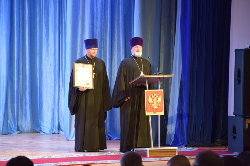 От имени Управляющего Епархией Архиепископа Петропавловского и Камчатского Феодора, подводников поздравил с юбилеем протоиерей Алексий Апатов и вручил Архиерейские грамоты морякам-подводникам, принимавшим активное участие в строительстве гарнизонного храма в Вилючинске.
