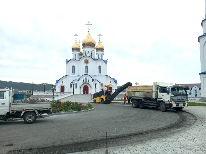 На территории комплекса Свято-Троицкого кафедрального собора проводятся плановые работы по благоустройству.