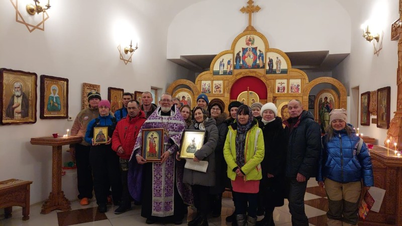 По благословению Владыки Феодора везу икону святой блаженной Матроны Московской с мощами, которая подарена была нашей епархии в 2010 году Патриархом Московским и всея Руси Кириллом, также образ свт. Иннокентия Московского с частичкой мощей. В каждом населённом пункте оставляю гуманитарку — Епархией подготовлены коробки с новой одеждой, которая раздается жителям сел. Сегодня из Коврана стартанули на Седанку- 110 км .Тяжелый был этап, мы на снегоходах днём пришли, а упряжки некоторые до сих пор в пути ещё. В Тигиле служили молебен.» — рассказывает отец Владислав.
