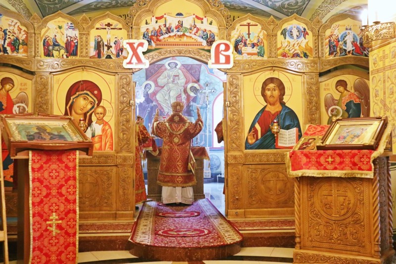 Во время богослужения в центре храма находился образ великомученика и Победоносца Георгия с частицей мощей, ковчег с мощами прав. воина Феодора Ушакова, ковчег с мощами святителя Иннокентия Московского.