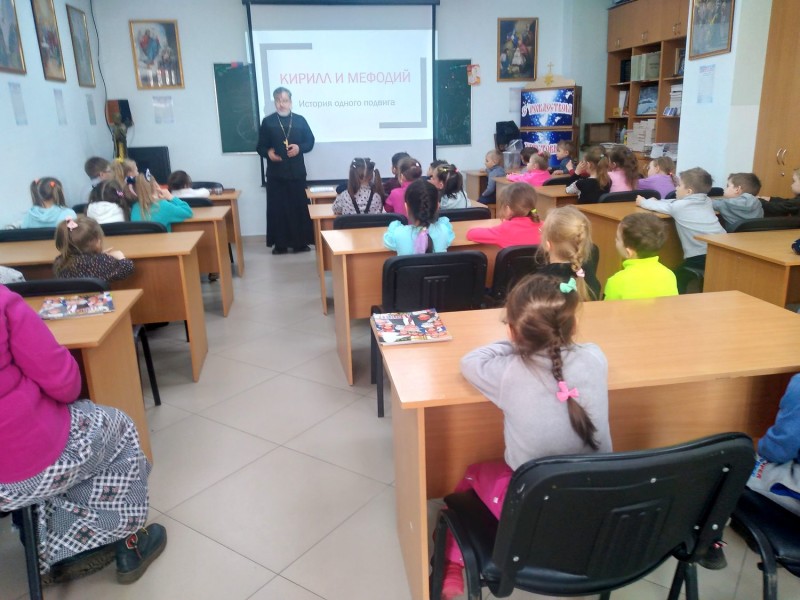 Дети узнали о том, как Кирилл и Мефодий – святые православной и католической церквей, братья-миссионеры из города Солуни (сейчас Салоники), проповедники христианства, стали создателями в 862 году старославянской азбуки и церковнославянского языка. Также попробовали написать пером и чернилами своё имя старославянскими буквами.