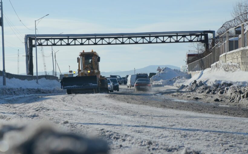 Дорожные службы через ливневые канализации обеспечивают отвод воды с проезжей части. Тем временем на дороге работает грейдер, который убирает наледь, образовавшуюся в результате утечки воды.