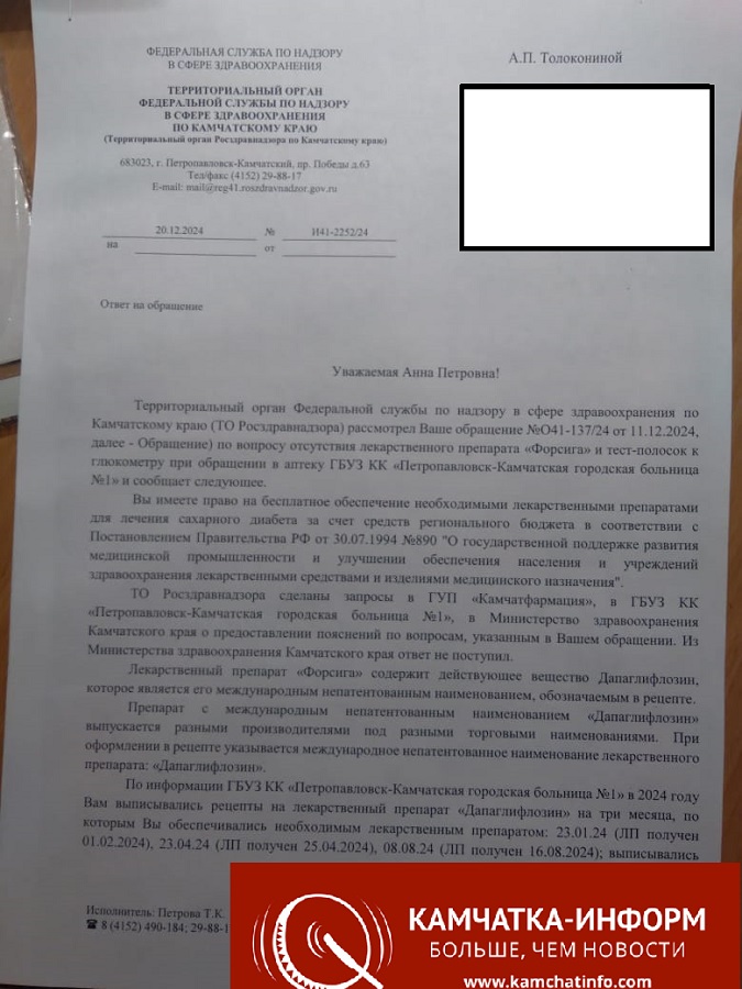 В распоряжении РАИ «КАМЧАТКА-ИНФОРМ» оказался любопытный документ - письмо Территориального органа Федеральной службы по надзору в сфере здравоохранения по Камчатскому краю от 20 декабря 2024 года в адрес милейшей пенсионерки Анны Петровны. Она пожаловалась на то, что не может купить по выписанному доктором рецепту необходимые при лечении сахарного диабета лекарства и тест-полоски. Так вот, ТО Росздравнадзора сделало необходимые запросы - в том числе, в больницу, где лечится Анна Петровна, аптечные организации, краевой Минздрав. Кроме того, были затребованы объяснения ответственных лиц. Было сделано все необходимое, чтобы оперативно помочь пенсионерке. При этом в своем письме Росздравнадзор сообщил заявительнице, что «закупка и распределение лекарственных средств и медицинских изделий для льготных категорий граждан производится Министерством здравоохранения Камчатского края», «обеспечение пациентов необходимыми лекарственными препаратами и медицинскими изделиями за счет средств регионального бюджета организует Министерство здравоохранения». «Таким образом, - черным по белому написано в письме, - Министерством здравоохранения Камчатского края допущено нарушение Ваших прав на получение доступной и качественной медицинской помощи» . Никаких больниц, аптек и других организаций в качестве «нарушителей» ТО Росздравнадзора не указывает.