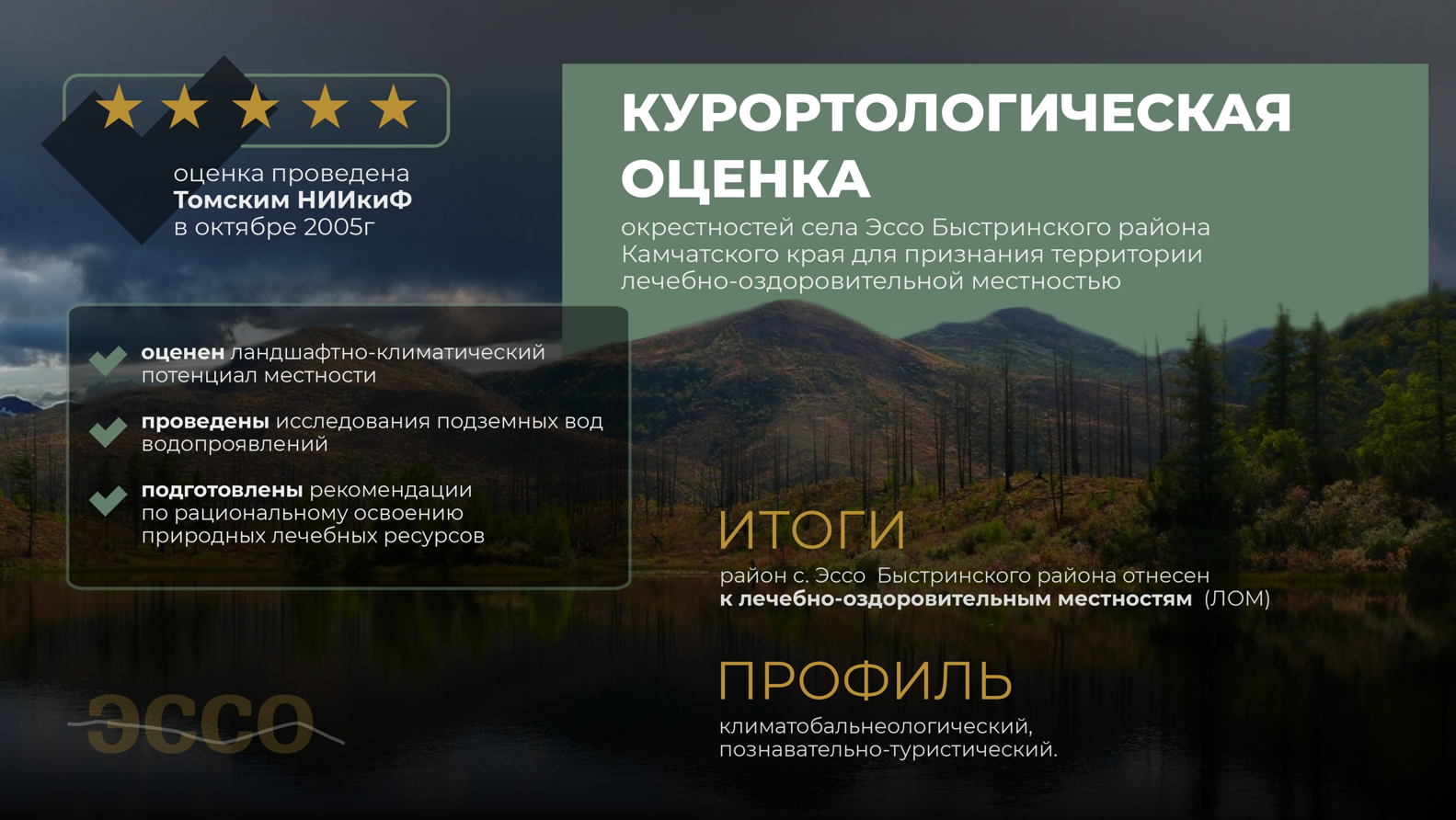 Добавим, быстринское месторождение гидротерм занимает особое положение, невысокая минерализация, специфический ионно-солевой состав, высокое содержание ряда микрокомпонентов указывают на значительную роль глубинной составляющей в термальных водах. Вода Эссовских термальных источников относится к минеральным кремнистым термальным водам для наружного применения. Как отмечают ученые, территория села Эссо Быстринского района относится к местностям с достаточным потенциалом для развития бальнеологического туризма.