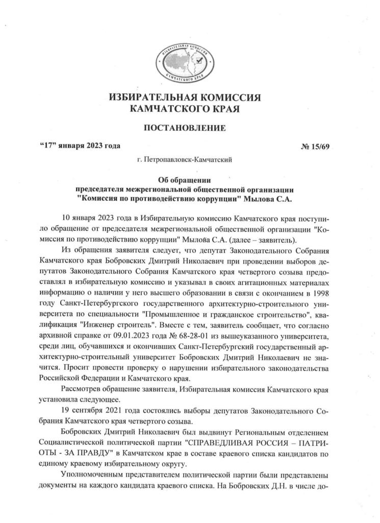 Камчатская избирательная комиссия вынесла решение по заявлению Сергея Мылова. Ниже приводим полный текст постановления.