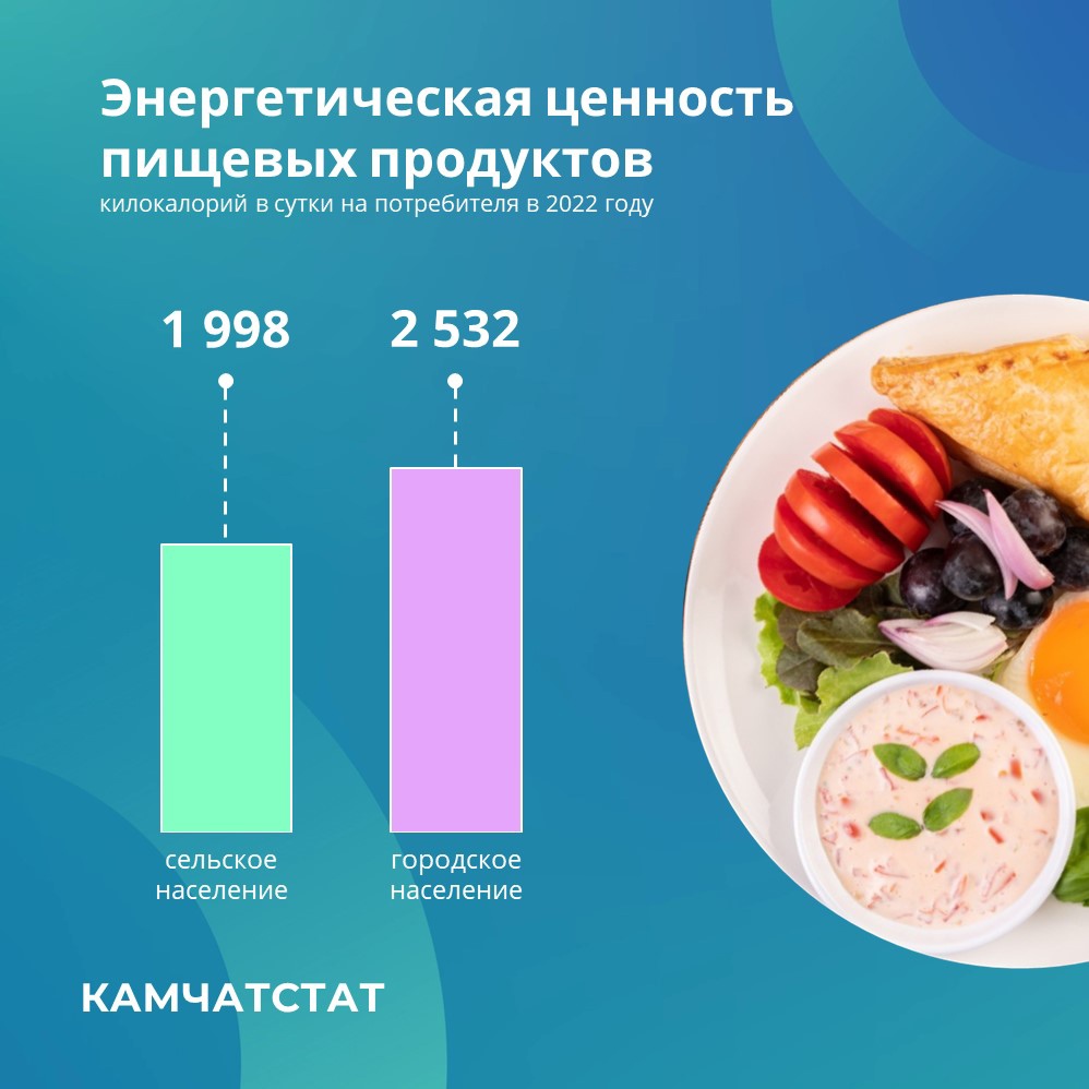 Средняя калорийность потребляемых продуктов в сутки на одного камчатца составила 2 421 килокалорий. При этом, согласно рекомендациям Роспотребнадзора, в среднем мужчинам требуется от 2 150 до 3 800 ккал/сутки, женщинам – от 1 700 до 3 000 ккал/сутки.